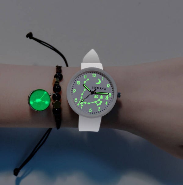 Reloj de dama analogo, extensible en silicona con broche simple, foto sensible, brilla en la obscuridad una vez le toque la luz, incluye pulsera textil