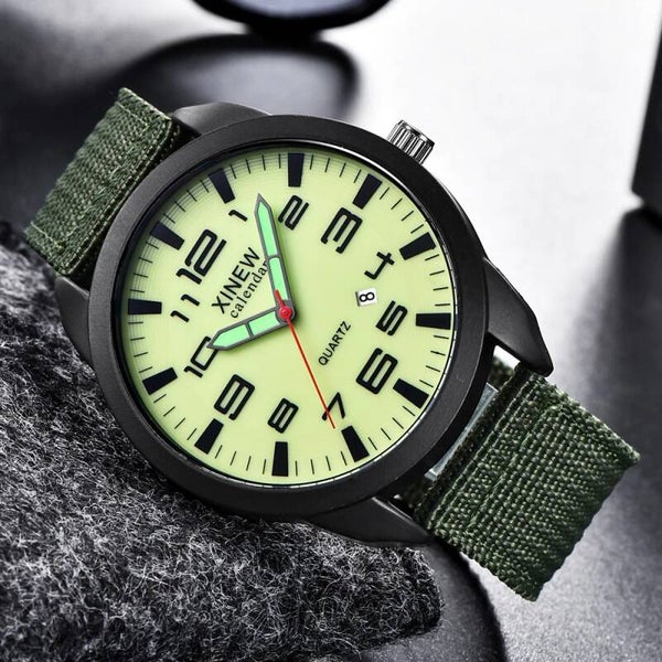 Reloj analogo de caballero con extensible textil y broche simple, cuenta con fechador