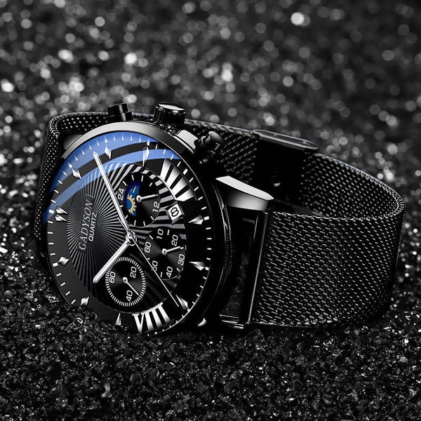 Reloj analogo de caballero con extensible metalico y broche simple, cuenta con fechador, incluye pulsera negra en hecha de material sintetico