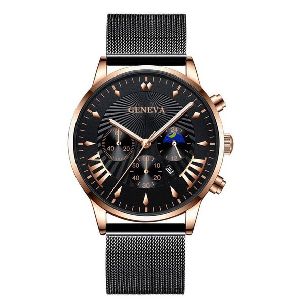 Reloj analogo de caballero con extensible metalico y broche simple, cuenta con fechador