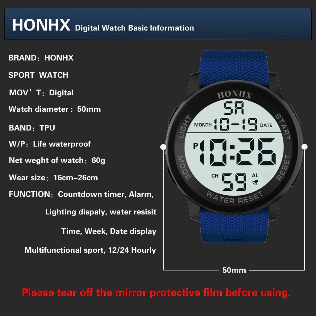Reloj digital de caballero con extensible en caucho y broche simple, marca hora, fecha, cronometro, alarma, y tiene luz.