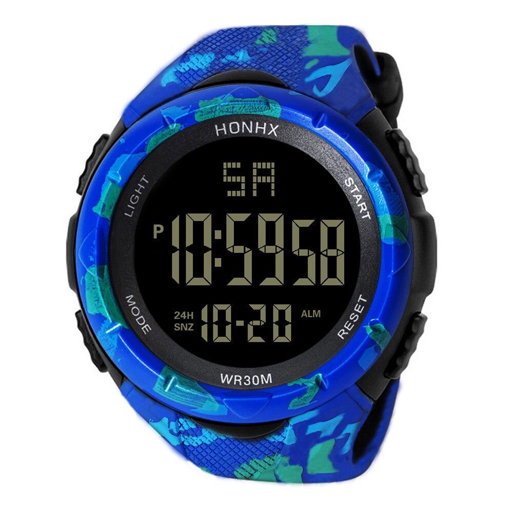 Reloj digital de caballero con extensible en caucho y broche simple, marca hora, fecha, cronometro, alarma, y tiene luz.